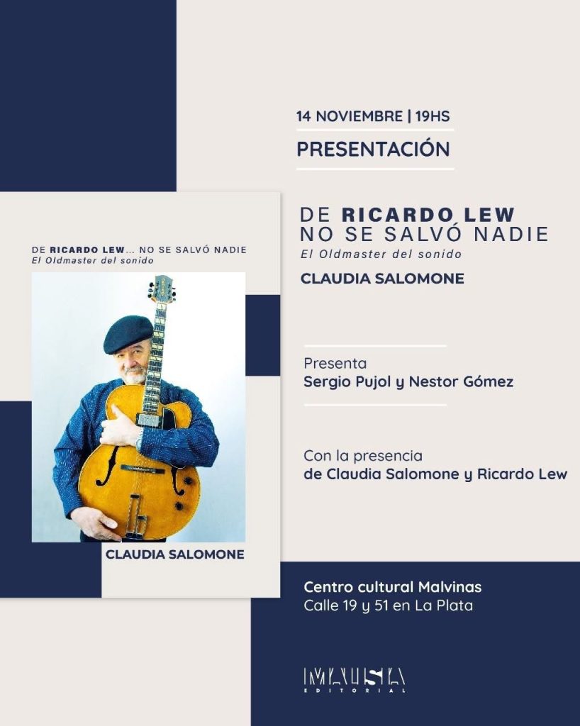 La autora es Claudia Noemí Salome, es docente, cantautora e investigadora de música popular argentina y latinoamericana. Desde los 80 viene realizando investigaciones, producciones discográficas, ponencias, conferencias, escritos y talleres en Argentina, Cuba e Italia. En la actualidad se reconoce en el campo de la ficción y recurre a la etnografía, la narración y edición de sonidos como búsquedas posibles , que involucren realidad, imaginación y escucha. Este es un brillante trabajo sobre el marestro Lew, Editado por Malísia editorial.